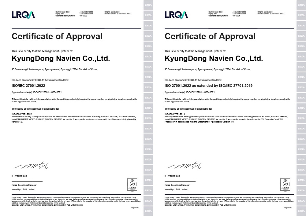 [November 6, 2024] KD Navien has simultaneously obtained the international certifications ISO 27001 for Information Security Management System and ISO 27701 for Privacy Information Management System.