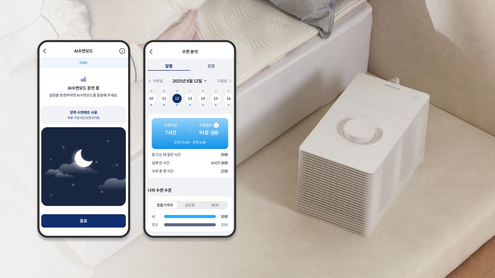 자다가 춥거나 더워서 깨지 않도록, 사용자의 수면을 분석해 계절에 맞는 최적의 온도를 제공합니다.