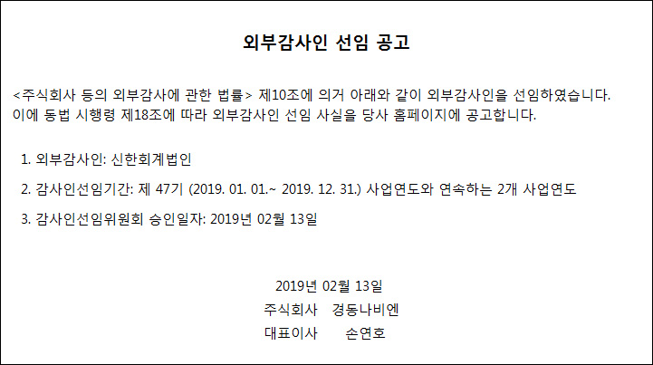 2019 외부감사인 선임 공고