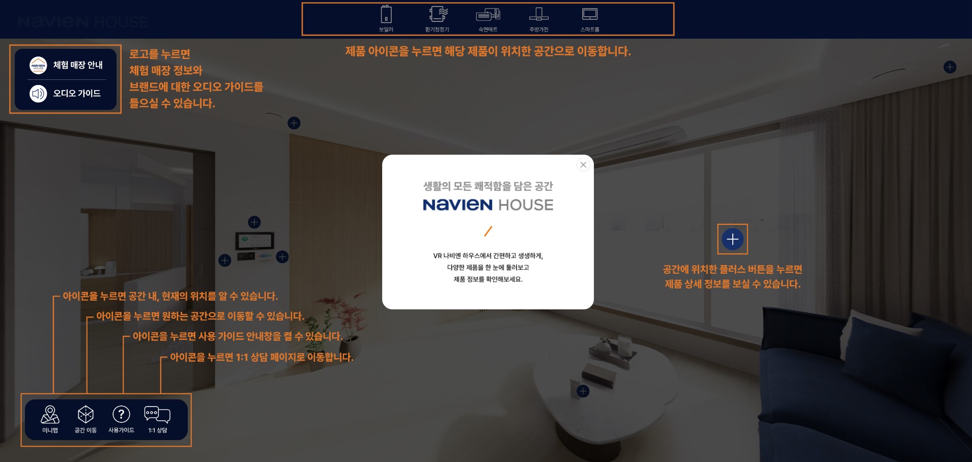 경동나비엔은 남양주, 의정부 등에 오픈한 체험형 대리점처럼, 온라인을 통해서도 고객이 손쉽게 제품을 접할 수 있도록 돕고자 온라인 공식 쇼핑몰인 ‘나비엔 하우스(www.navienhouse.com)’ 안에 가상의 집을 꾸몄다. 경동나비엔의 제품 특성상 전문가가 직접 설치해야 하는 것들이 많아 고객이 체험할 수 있는 기회는 상대적으로 적었다. 이에 경동나비엔이 VR 나비엔 하우스를 오픈, 시공간에 구애 없이 제품을 생생하게 체험할 수 있다.