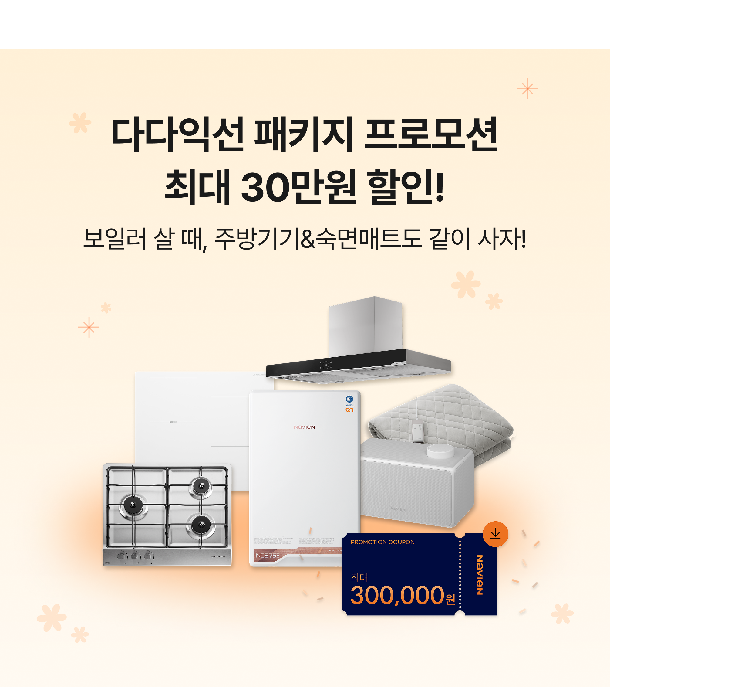 이번 프로모션은 경동나비엔의 다양한 생활환경가전을 합리적인 가격의 패키지로 제공해 더욱 많은 고객에게 ‘쾌적한 생활환경’을 선사한다는 취지로 진행된다. 패키지는 총 세 종류로, 구매 제품에 따라 최소 5만원에서 최대 30만원까지 할인을 제공한다. ‘주방까지 多 패키지’는 콘덴싱 보일러(NCB 354/553/753)과 나비엔 매직의 후드 또는 레인지 제품으로 구성되며, ‘숙면까지 多 패키지’는 콘덴싱 보일러와 숙면매트 온수/카본 제품으로 구성된다. 콘덴싱 보일러와 주방기기, 숙면매트 세 제품을 동시에 구매하는 ‘전부 多 패키지’는 최대 30만원까지 할인 받을 수 있다.